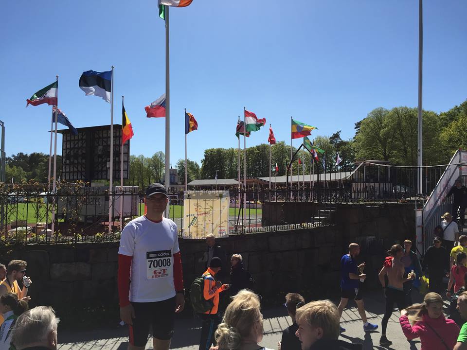 A délutáni rajt következtében reggel nem kellett kapkodni, de azért izgultunk, hogy érünk oda. Fölférünk-e a buszra, meg lehet-e majd a helyszínen mozdulni? Felfértünk. Nem volt nagyobb közönség, mint szombaton délelőttönként a hetes buszon. Fél óra a versenyközpontig, mindenki oda tart, addig is utastársak, futócuccok, szettek méregetése, fitymálás, irigykedés. A végállomáson aztán már hömpölyögött a nép, nagyon sok ember. Futók sűrűn, amíg a szem ellát. Ja, és gyönyörű napos idő, 13 fok, közepes szél, a svédek ezt is megszervezték. Elég lesz a technikai póló, semmi nem kell alá.