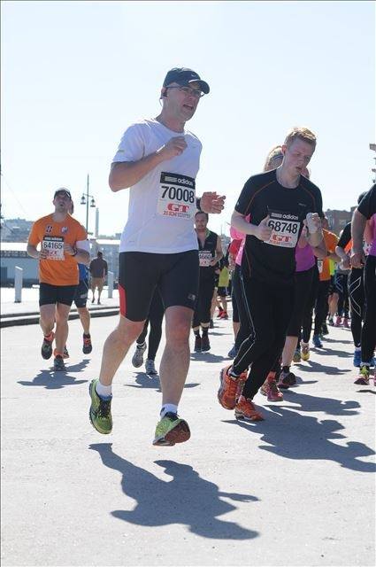 Előremásztunk oda, ahol a legjobbak sorakoztak, és megvártuk az első rajtot, egy óra múlva meg az első befutókat. Érkezett Richard Mengich barátom, és a többi kenyai, eritreai. Eritrea az eritreaiaké, mondogattam magamban, aztán tizenkettediknek beért az első európai, egyben svéd fickó. Lelkesen zúgott a tribün. És jött a többi villámember, potty-potty egyre sűrűbben. Ekkor még mindig szűk két óra volt az én rajtomig. Fahéjas csiga, banán, pisi, víz, pisi. Futottam öt percet, aztán beálltam a 23-as számú falanxba. Rajtszelfi, bátorító sms-ek, szétszedem a világot, ez a legjobb az egészben. Na, mikor indulunk. Most. Hopp, Dorcsi jó helyett fogott, első métereimről is készült fotó. Sűrűn voltunk, komótosan kezdtünk, az első kilométer éppen 5:20-on belül. És innen megindítottam a nagy előrenyomulást, állandó kitörésekkel, cikázással, húszméteres sprintekkel, olykor satufékkel. Egész más volt, mint a Vivicitta. Ott a gyors futók húztak maguk után, és a táv második felében el is hagyogattak szépen. Itt meg bámm-bámm-bá-bámm-bá-bá-bá-bámm-bámm ezeket mind lehagytam, végig-végig, túlzás nélkül sokezrével. Szűk volt a pálya, de haladtam egészen a hídig. Ide gyakorlatilag egy meredek ösvény vezetett fel. Volt, aki már itt sétálni kezdett, szóval bedugultam, jól. A hídon is csak két sáv volt a futóknak fenntartva, a végén pedig megint hosszú ösvény; így szó sem lehetett arról, hogy szépen futom 4:50-es kilométereimet, ahogy amúgy erőm, úgy éreztem végig, engedte volna. Nem baj, állva halunk meg, küzdöttem, előzgettem továbbra is. A Runkeeper szerint elég jó átlagot tartottam, de ebben nem lehet megbízni, a teló mindig valamivel optimistábban mér, mint a szigorú csipecske.