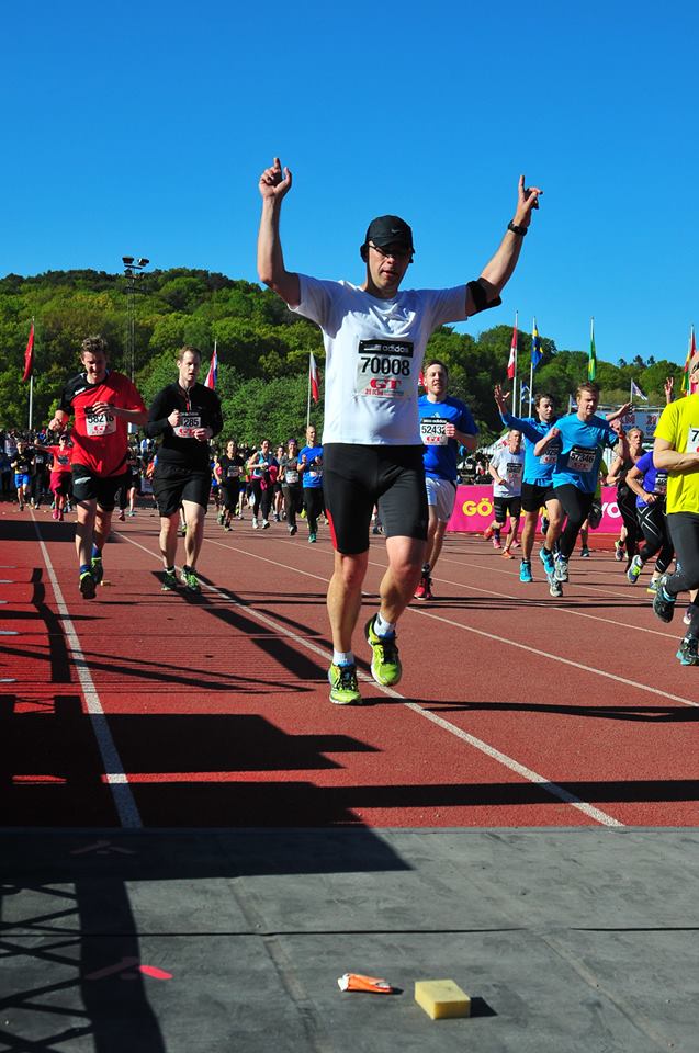 A hatalmas létszámot valahogy kezelni kellett, így a szervezők 25 rajtzónára osztották a mezőnyt. Azok, akik korábban itt vagy más svéd versenyen már regisztráltak valami eredményt, azokat ennek megfelelően sorolták be. Gyorsak előre, kevésbé gyorsak hátra, regisztrált idővel nem rendelkező újoncok és leglassabbak a legvégére. Én ennek megfelelően a 23. csoportból rajtoltam, 15.45-kor. Ez nyilván nem a legszerencsésebb, de előre nem lehetett tudni, pontosan mire készüljek. Úgy okoskodtam, hogy az egy hónappal ezelőtti Vivicittán elért 1:44:44-es egyéni és céges csúcsot jó lenne itt megjavítani, de még jobb lenne kiélvezni a Göteborgsvarvet minden percét, ahogy Gabi tanácsolta. Azt azért elhatároztam, hogy nem adom fel egykönnyen a rekorddöntést, meg fogok küzdeni érte. Kör modig! – azaz bátor futást –, ezt is Gabi küldte. És kapaszkodónak ott volt nálam minden, ami a Gizion és a cégescsapatból érkezett, sok vállveregetés, szurkolás, és a legeslegjobb szimbiózis.