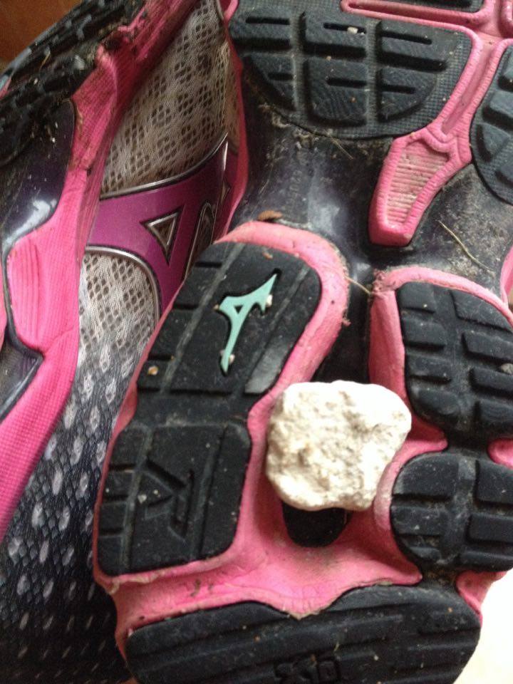 40. Nem tudom, lehet, hogy jövő októberben nem leszek ugyanettől a számtól ilyen boldog, de itt felhőtlen az öröm, különös tekintettel az aprókavicsos szakasz végére. A betonon viszont a jobb Mizuno furán elkezdett kopogni, próbáltam csusztikolni a lábamat, hogy kijöjjön, ami beleragadt, de nem akart. Utólag láttam, hogy mit kaptam ajándékba.