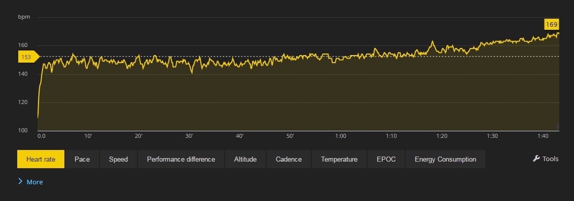 „Első 10 km-en maxHR 150, 16 km-ig maxHR 153, 18 km-ig maxHR 155, onnan nem az órát nézed, hanem futsz az életedért!” Ennyi!