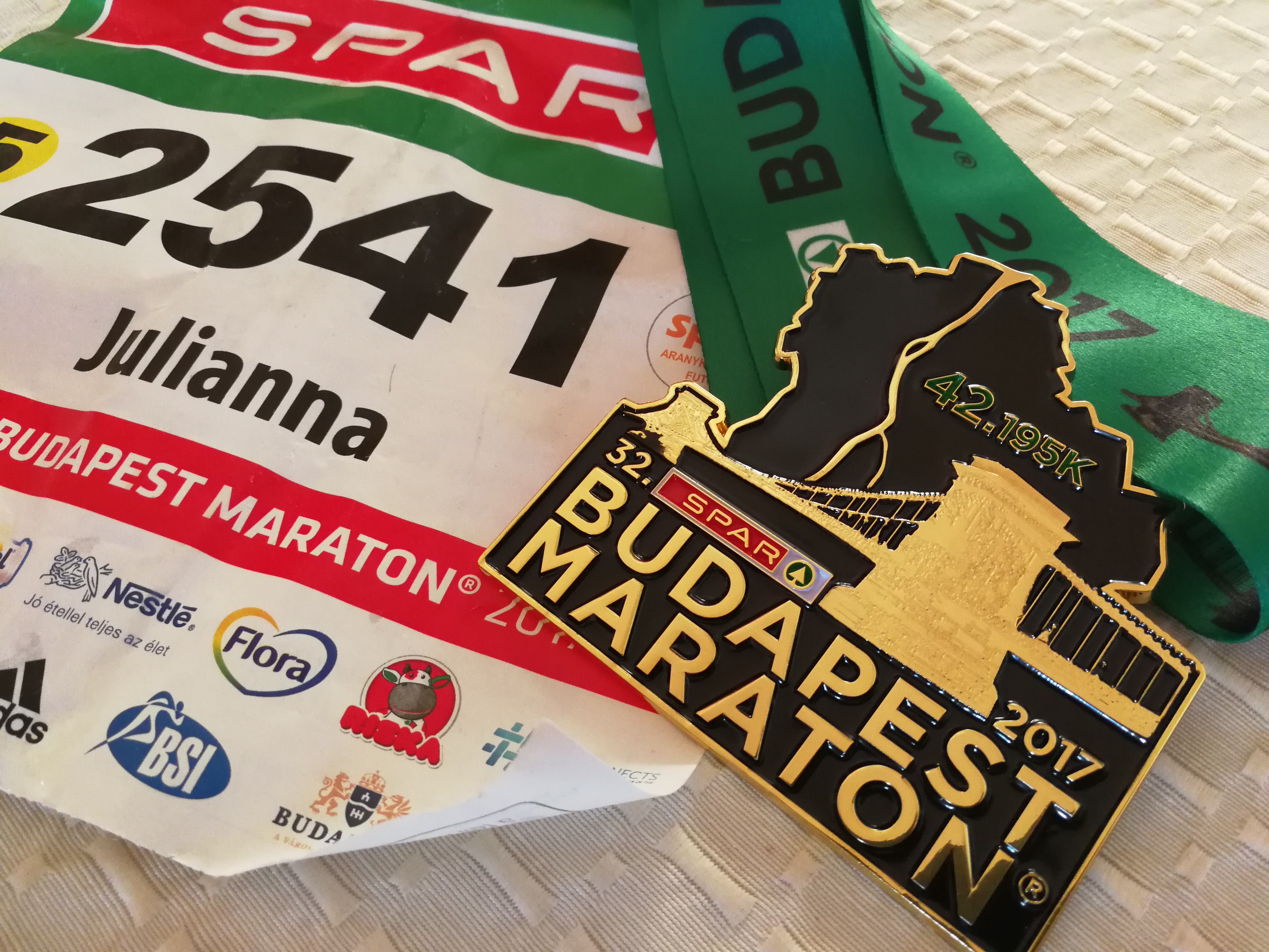 Aztán eljött a maraton hete. Fejben és térképen végigfutottam a teljes távot, végiggondoltam a frissítéseket. Azt is elterveztem hogy szeretnék egy napot pihenéssel, nyújtással tölteni. Ez végül szombatra adatott csak meg, ráadásul az egész hetem nagyon erős lett munka szempontjából. Szombaton Atival kimentünk átvenni a rajtszámokat, és persze kicsit rá akartunk hangolódni a vasárnapi versenyre. Lubics Szilvit is meg kellett látogatnom, hiszen az első félmaratonnál is találkoztunk. Egész héten izgultam a verseny miatt hol jobban, hol kevésbé. A Gizionoktól kapott mantrák sokat segítettek: „lehetnék Hanka és szophatnék 246 km-en, de szerencsére én Juli vagyok és csak 42 a küzdelem tárgya”, gondolj arra, hogy te egy “kib.szott futógép” vagy, “ügyesen, csak kezdj el futni és állj meg, amikor szólnak. Elég egyszerű sport.” Szombatra úgy éreztem megnyugodtam. Kicsit meleg lesz de lesz de azért megcsináljuk. Aztán ahogy Szilvinek kimondtam hogy az első maratonra szeretném dedikáltatni a könyvét eltört a mécses. Még jó hogy ott vele