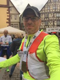 Talán korai is volt ez a százas, de elcsábultam. Bajor falvak közt, csendes folyócska mentén, borvidéken, kastélyparkon át vezet az út. Semmi olajfinomító, autópálya vagy dögtemető. Már a turizmusért megéri! A koreográfia azért mégis kicsit Spartathlon-os. A feladat: napnyugtáig eljuttatni egy üzenetet egyik várból a másikig. A sikeres futárt a célban lovaggá ütik. (Elképesztő érzés 100 kilométer után a macskakőre térdelni, hogy lovaggá üssenek. 🙂 )
