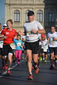Aztán feltűnt Erna, lekaptam magamról a páros rajtszámot, amit már csak egyetlen luk tartott a derékgumin, jó hogy el nem hagytam. Kezébe nyomtam, és elszaladtam. Legalábbis ez volt a terv, de valójában még egy kilométer múlva is előttem futott. A maraton második fele kezdett felkapaszkodni a hátamra, szőrös karját a nyakam köré fonva. Kis elnehezedés jött, de rendületlenül pörgettem a pozitív gondolatokat. Orsit vizslattam. Mindig tök feketében fut, ilyen kevés van, észre kell vennem. A finom lassulás nem nagyon aggasztott, mert a fő célhoz már elég előnyt szedtem össze. Ha el nem pusztulok, hazaérek. A 30. kilométer még 5.30-al ment, aztán innen 39.-ig szigorúan monoton fogyogattam. Orsit végül 30 és félnél értem utol, nagyot ment, de már alaposan el volt tikkadva. Együtt hörögtünk egy darabig, aztán még a Műegyetem rakparton szétváltunk. Nyomni tovább. Biztosan meglesz.