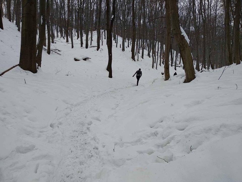 Kb 1 km múlva oké voltam teljesen (fejfájás maradt), azt hiszem agyban kellett inkább összeszedni magam, tisztáztam magammal hogy kevés volt a kaja, enni kell, akkor szépen lazán befejezem a maradék 11 km-t, ami lóf@sz, azt félhullán, sőt egészen hullán is bármikor lefutom, függőlegesen is felfele akár, úgyhogy száj befog, hiszti nincs, futás van :D. Megettem egy gyümölcsszeletet is, és futottam, kényelmesen, már amennyire a hóban lehet kényelmesen futni 🙂 Tudtam hogy 17 km-től lesz 2 km, amin 150-170 m szint van, azt vártam, hogy azon a gyalogláson legyek túl. Na, az szar volt nagyon – keskeny nyom, kb térdig erő hó, és csúszott veszettül. Felfelé gyaloglás közben is ettem, és arra gondoltam, hogy ez igazából semmi, Tomiék előző nap sokkal durvább körülmények között sokkal többet mentek,