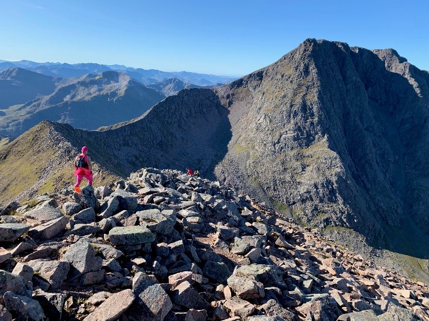 Mint minden rossznak, ennek is vége lett egyszer: elindultunk felfelé, elhagytuk a völgyet és elindultunk felfelé a Ben Nevis csúcs irányába. Érdemes megjegyezni, hogy mivel a verseny során csak egy frissítőpont volt cca. 30km-en, így a víz pótlásra a patakok jelentettek megoldást. Emiatt nem voltam nyugodt, hiszen elég intenzív állattartás volt a területen – tehát inkább a magasabb régiókban igyekeztem a folyadékot pótolni. Az órám szintadatainak tanulsága szerint ez a második emelkedő cca. 1300 m szintet tartalmazott, Meredekebb majd kevésbé meredek lejtőn oldalazva értünk el a meredek rész beszállásához. Itt a botokat érdemes volt eltenni (mint utólag kiderült: kötelező is volt😊), hiszen nagy köveken mászás, ugrándozás, igazi hamisítatlan brit „boulder-hopping” jött. Az első és igen meredek előcsúcs után jött a híres – hírhedt CMD (Carn-Mor Deag) gerinc, kétoldalt mély letöréssel, és nem túl széles gerinccel. Ezt a gerincet többé kevésbé követve értünk el az utolsó meredek kőgörgeteghez – aminek a tetején a kőkunyhók jelezték a csúcsot (Ben Nevis +1345). Érdekes volt, hogy bár itt már nagyon meleg volt és sütött a nap, de a szél őrülten fújt – ez tehát duplán szárított.