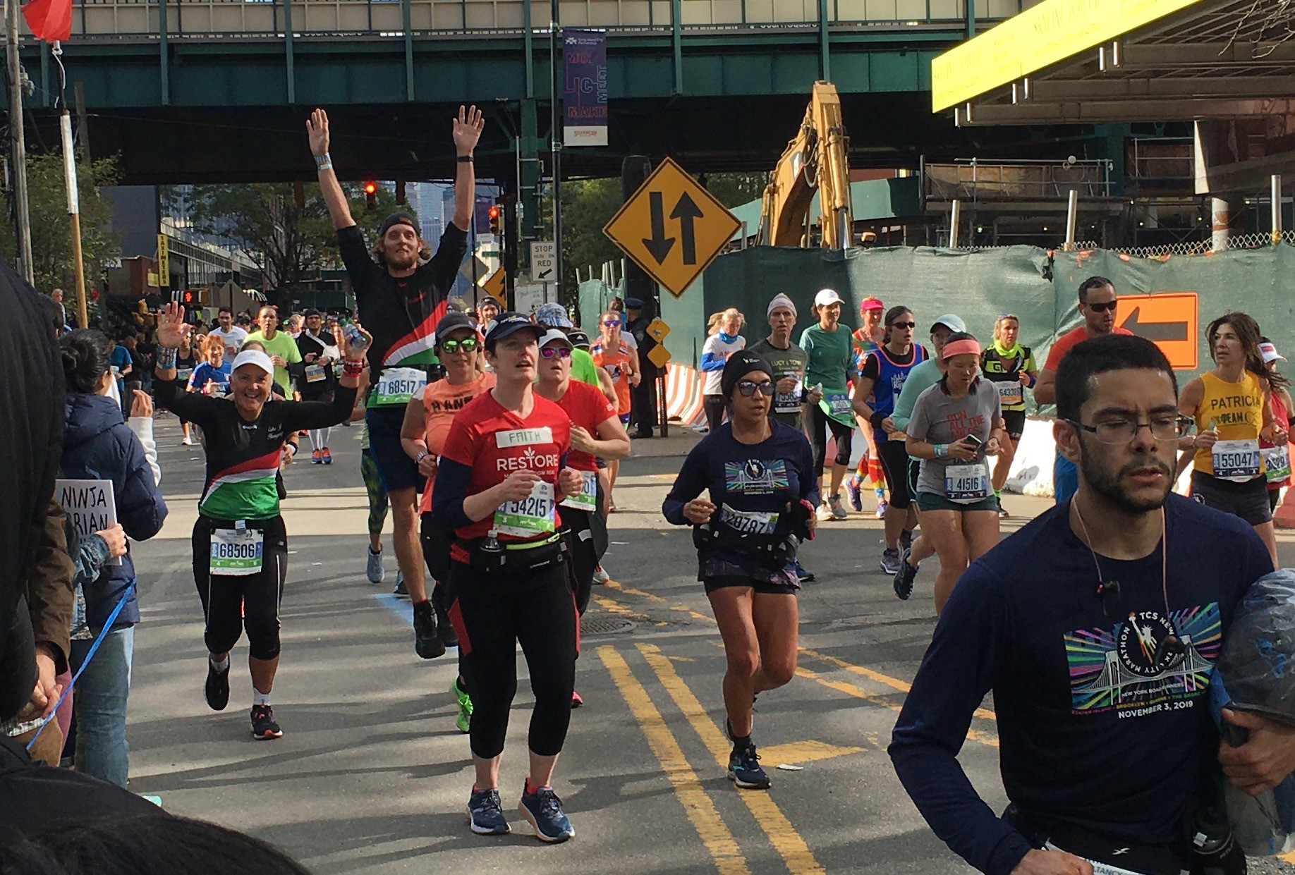 Megbeszéltük, hogy nincs minden mérföldön “büfézés, nem állunk meg csak lassítunk ha szükséges inni. Én vittem egy pici üveg vizet, mert pohárból nem tudok inni menet közben. Ezt töltötte Patrik újra szükség szerint. 45 percenként gél és a vége felé banán. Mivel kétoldalt volt a frissítő igyekszünk középen elmenni a futók közt. Beálltunk a rajba, boldogság, kis elérzékenyülés a tavalyi emlékek miatt majd himnusz, ágyú dörgés és gyerünk. Szép lassan vissza fogva Patrikot végig kígyóztunk a hídon kb 2.5 km-én keresztül. Hátborzongató mikor a hídon a szembe sávban dudálva kísérnek és bátorítanak a rendőr, mentő autók, a UPS konvojban szállítja a csomagokat a célba. Óriási hangulat volt, rengeteget pacsiztam idén is, tavaly azért, hogy feledtessék a fájdalmat, idén a hála miatt. Boldog voltam, ahol szólt a zene vagy élő zene volt táncoltam, énekeltem. Szuper buli hangulatot ad ahogy 42 kilométeren keresztül több száz idegen ember tömött sorokban szurkol. 6 majd 16 mérföldnél várt Lili és Feri majd a Nemzeti zászlónál a célegyenesben ide adták a miénket.