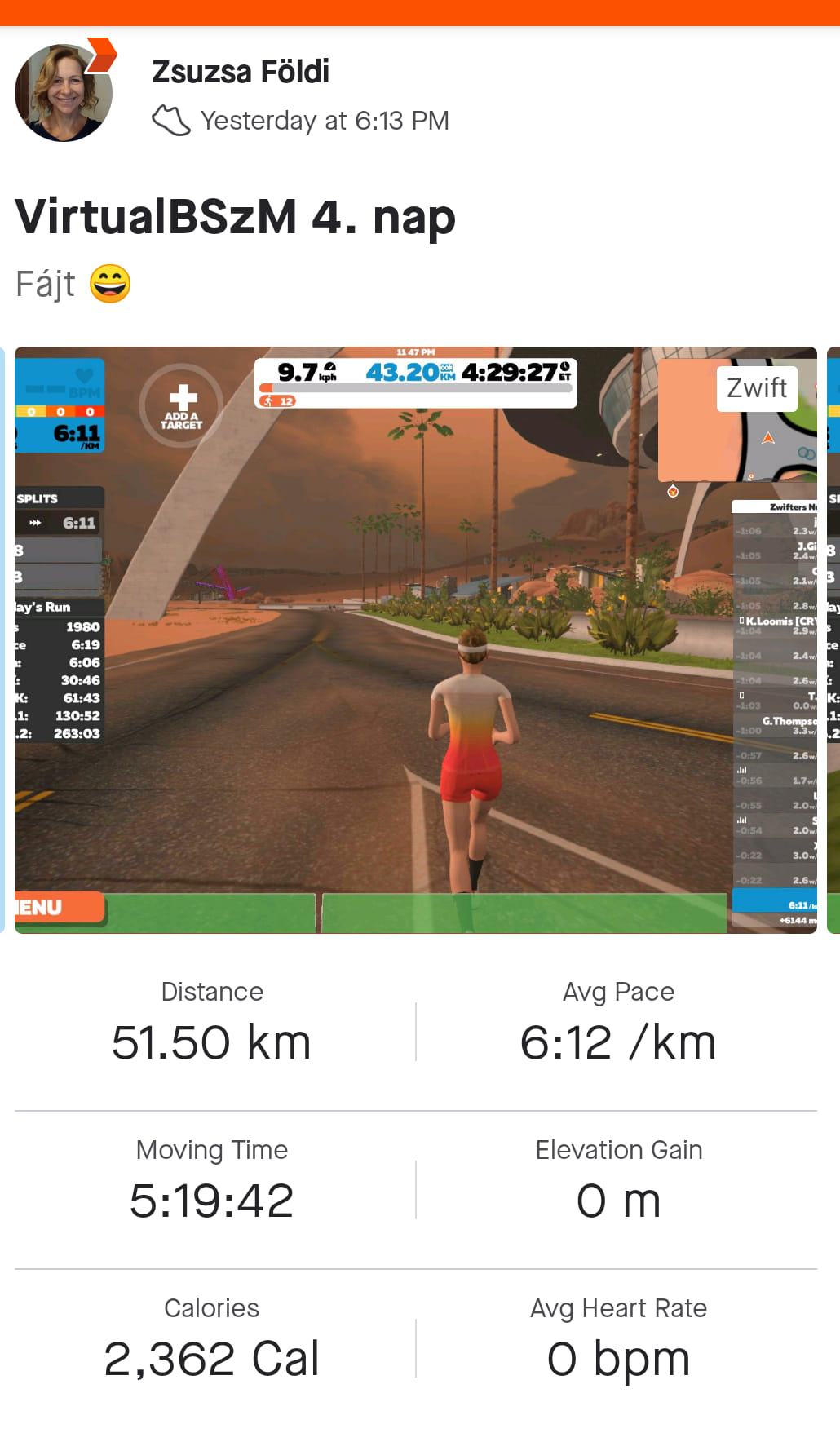 Délelőtt három gyerek online suli, plusz egy ovis lekötése (nem szó szerint 😀 ), hogy a többiek tudjanak tanulni. Mivel este 8 után az utcán nem lehet tartózkodni, rögtön pados futással kezdtem meg a négy napos mókát. Délután 5 után tudtam kezdeni, gyerekeket elrendeztem, a nagyok cukik voltak, rendezték a kicsiket, hogy ne este kelljen kezdenem, és éjfél után végeznem. Frissítés pad mellé a polcra (izó, sótabi, víz), könnyű laza tempó, 6 perc körüli, így kényelmesen tudtam tartani a megadott max158-as pulzust. Zwift appot használok a pados futásoknál, így ha nem köt le a film, vagy nem akarok tv-t nézni futás közben, akkor sem unalmas (csak veszélyes, ha egy gyorsabb futó elhúz mellettem a virtuális térben, emlékeztetni kell magam, hogy oké, hogy verseny, de na, van még 3 nap, csak ésszel 😉 ). Három Poirot filmet megnéztem, viszonylag gyorsan eltelt az öt óra a padon, közben 20 percenként frissítés, nem unatkoztam egy percig sem. 49 km lett a vége, este 10 körül végeztem, nyújtás, kis óvatos henger, vacsora, éjfél körül már aludtam.