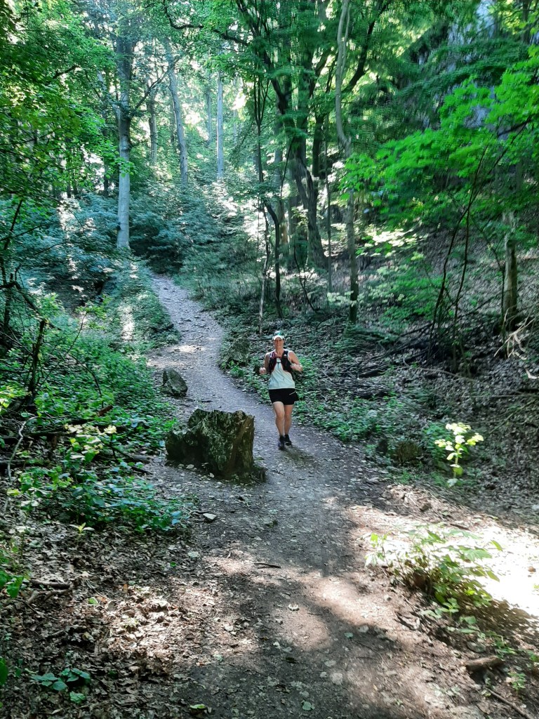 Innentől újult erővel, felfrissülve mentünk tovább. Az erdő csodás volt, lenyűgözött, mint mindig, az emelkedőkön tudtam nézelődni, élveztem az egész futást, úgy ahogy van! 4 óra alatt meglett 31 km, aminél még sosem futottam többet, innentől már minden lépés rekord. Viszont kb. 29-30 km-nél a lefeléken elkezdett jelezgetni a bal térdem külső része. Ajajj, IT szalag lesz az, gondoltam, eddig minden 25 km feletti távnál jelzett, meg is ijedtem, hogy mi lesz így, hiszen még van vissza 10-12 km…. Aprókat lépve, óvatosan ereszkedtem lefelé, síkon és felfelé semmi gond nem volt! 35 környékén kezdtem érezni, hogy na jó, akkor most már elfáradtam, fájnak a farizmaim is, akár vége is lehetne. 😀 De még 7,2 km, ami kicsit több mint a Sasad-Gazdagréti köröm, ami 6 km. Innentől pár száz méterenként néztem az órát, és számoltam vissza, hogy mennyi van még a kis itthoni körömből. Nem igazán fogytak a méterek, pedig futottam. Az utolsó 10 km-en egyébként már napsütötte helyek futottunk, aszfaltos rész is volt már, kezdett nagyon sokat kivenni belőlem a meleg. De nem szenvedtem látványosan, csak már kezdett elegem lenni, és örültem volna, ha valaki nyakon önt egy vödör jéghideg vízzel. Ehelyett néhány csepp langyos vizet kaptam csak a kulacsokból.