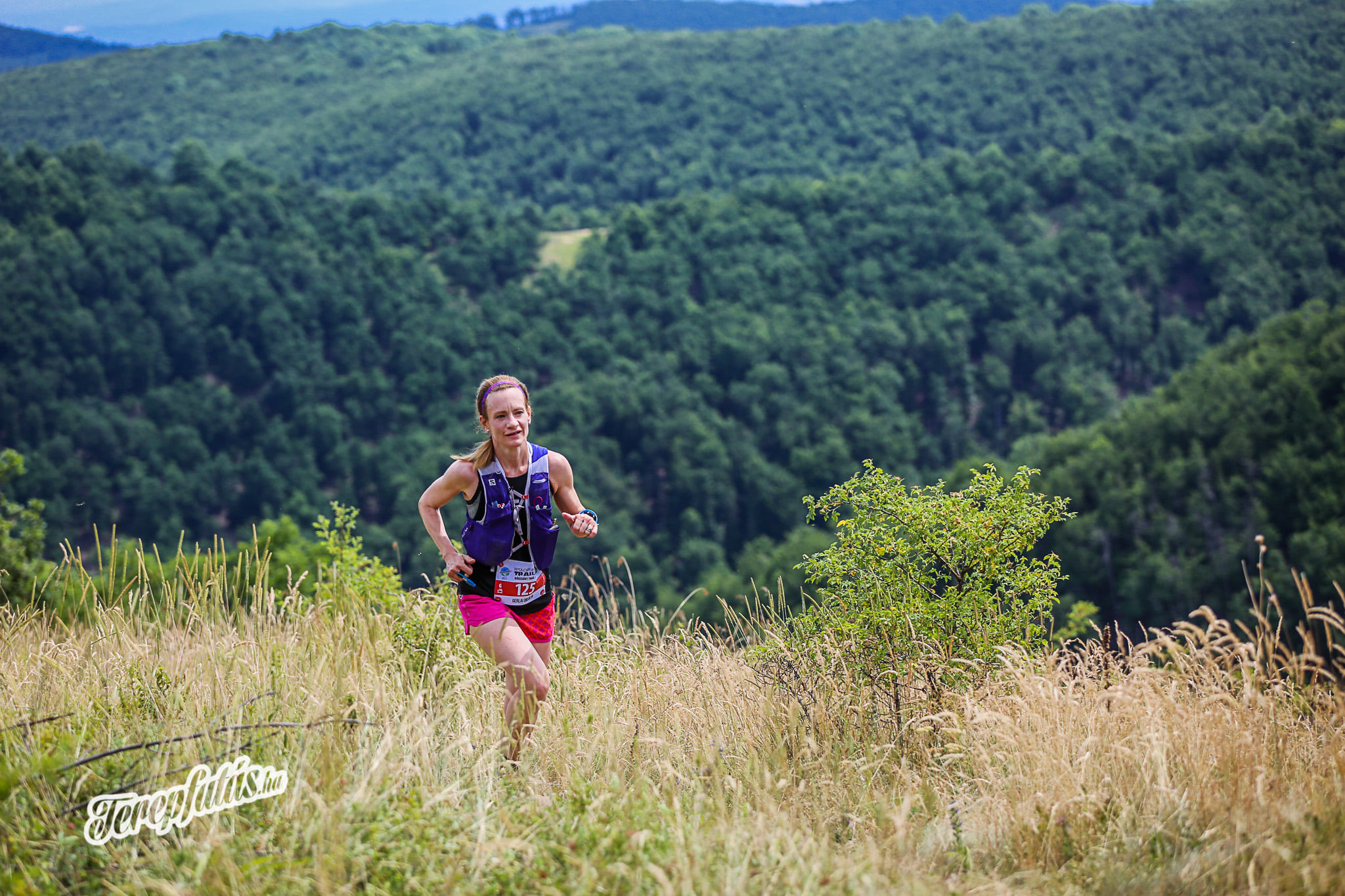 Szóval felgyalogoltunk az első hosszú (végtelen) emelkedőn, kezdtem kicsit magamhoz térni, a gyomromnak imádkoztam, hogy oké, akkor csak gélt eszem, de azt muszáj bent tartani, különben végem. Szerencsére, működött, pont, mire a gyomrom elbánt a bevitt gél adaggal és émelygéssel, időszerűvé vált a következő (30-35 perc múlva). Gyakorlatilag érzésre köveket pakoltam a gyomromba, de nem volt ezzel baj hosszabb távon. A korábbi évekhez képest nagyon élveztem, hogy ismerős részek jönnek, amiket végre volt energiám megcsodálni, és az emlékezetemben is megmaradtak. Királyháza előtt a trükkös lejtőkön én is elkezdtem előzni, lányok már akkor sem voltak a környéken, a fiúk előzékenyen előre engedtek. A patak után az első frissítőponton szóltak, hogy negyedik vagyok, először gondoltam, hogy “Peeersze, vicces, Csanya mindenkinek ezt mondja”, de aztán, miután már többedik vigyorgó Crew tag mondta, kezdtem elhinni. Hoppá, akkor kövek ide avagy oda, (rock’n’roll :)), tartsuk ezt meg. El sem tudtam képzelni, hogy hova lettek a többiek, nekem úgy tűnt, sokan mentek el mellettem az elején.