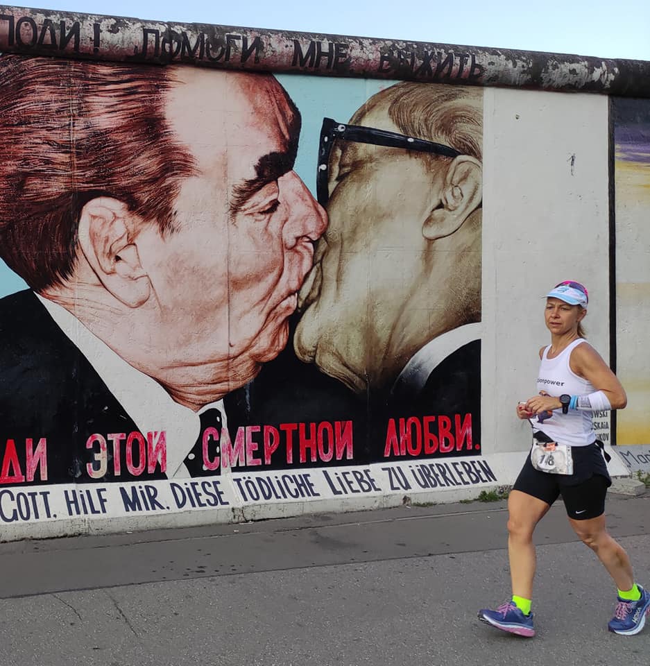 Az első 15-20 km lassú lett, főleg a rengeteg közlekedési lámpa miatt – útvonalbiztosítás nincs, ha piros a lámpa, állunk. Utólag megnézve az első 20 km-en 9-10 perc állásom volt emiatt, de ezt tudtuk, hogy így lesz, Józsi felkészített rá. Gáborral nagyjából az első ponton, 9 km körül (Checkpoint Charlie) találkoztunk (a rajtba nem jöhetett velem a járványügyi előírások miatt) kicseréltük a kulacsokat, ő fotózgatott, én kocogtam. A városból 30 km körül értünk ki, előtte volt a megemlékezős pont – minden évben a versenyen egy, a falnál meghalt emberre emlékezünk, és az ő emlékhelyénél van egy nagyjából 1 perces megemlékezős állás. Az útvonalon végig vannak emlékhelyek, ez tényleg nem egy szokványos “csak egy kört futunk” verseny, itt végig minden emlékeztet arra, hogy 35 éve még állt a Fal…