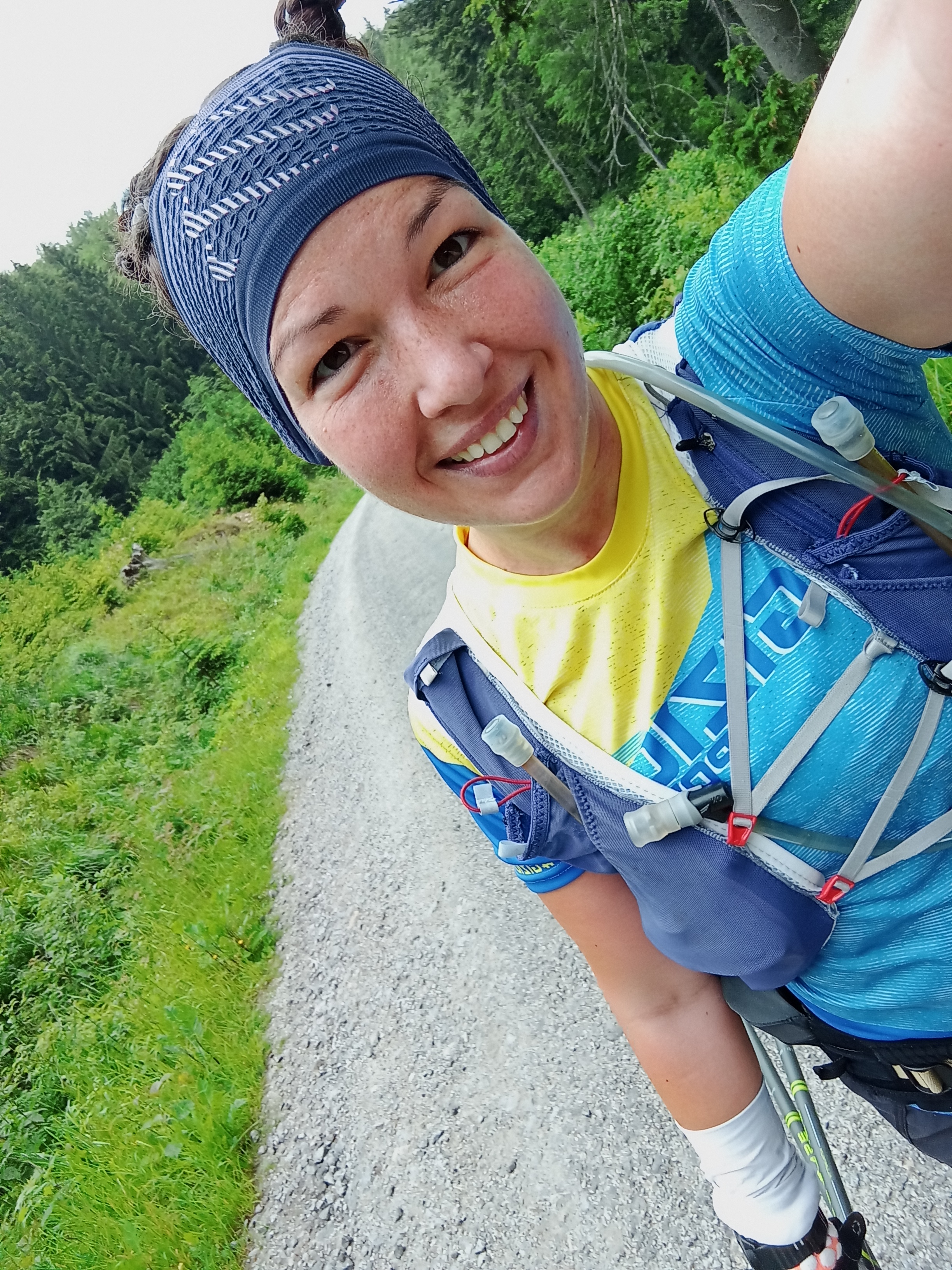 6:00-kor rajtoltunk a faluból, majd egyből egy szép kis emelkedő… hát ez hirtelen jött, pedig tudtam, hogy milyen a pálya, tényleg nem egy bakonyi emelkedő. 🙂 Ezt a morcos menetelést a reggelnek tulajdonítottam, és nagyon ügyeltem rá, hogy a mentális 100 Ft-omból egyet se költsek sirankozásra, úgyhogy szépen leszegett fejjel mentem fel 364 méterről 1035-re, ahol várt minket egy frissítőpont. Örültem, hogy vége az első emelkedőnek, jön a lejtő, lehet csapatni. Szerencsére futható is volt – bár nekem sikerült elesni