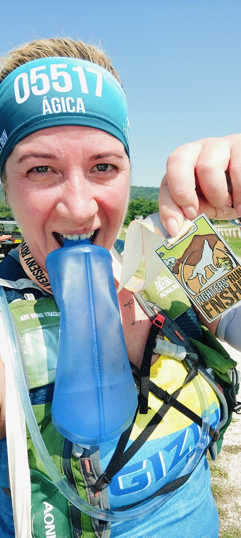 Lajos forrás, frissítés, oké nehezén túl vagyok (gondoltam naivan). K…a meleg van viszont. Jég a karszáraimba, víz a fejemre tarkómra és gyí tovább. Jön a lefelé. Na ez így annyira technikás volt, hogy a pulzus nagyon nem akart lemenni. Egyszercsak éreztem a bal hajlítóm. Ez nem lesz jó, előttem még egy emelkedő. Dobtam egy sótabit (egy már ment kezdésnél), ez egy kicsit helyre rántott. És végül leértem még kisebb dombokkal síkokkal vegyítve. Mielőtt újra aszfaltra fordultunk, még egy vizezés lehetőség volt, itt már teljes testtel álltam bele. És jött az utolsó két kili, aszfalt majd a lőtéren tűző nap és emelkedő. Ezt már egyetlen porcikám se kívánta, felzabált rendesen. No de ott lebegett a cél… Itt már senki nem adja fel ugye? Úgyhogy beértem… Tíz kili csak, de az enyém ebben a melegben is, egyedül leküzdve.