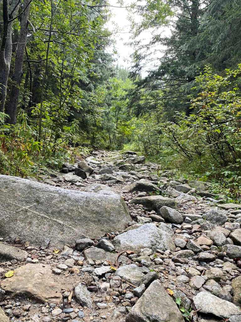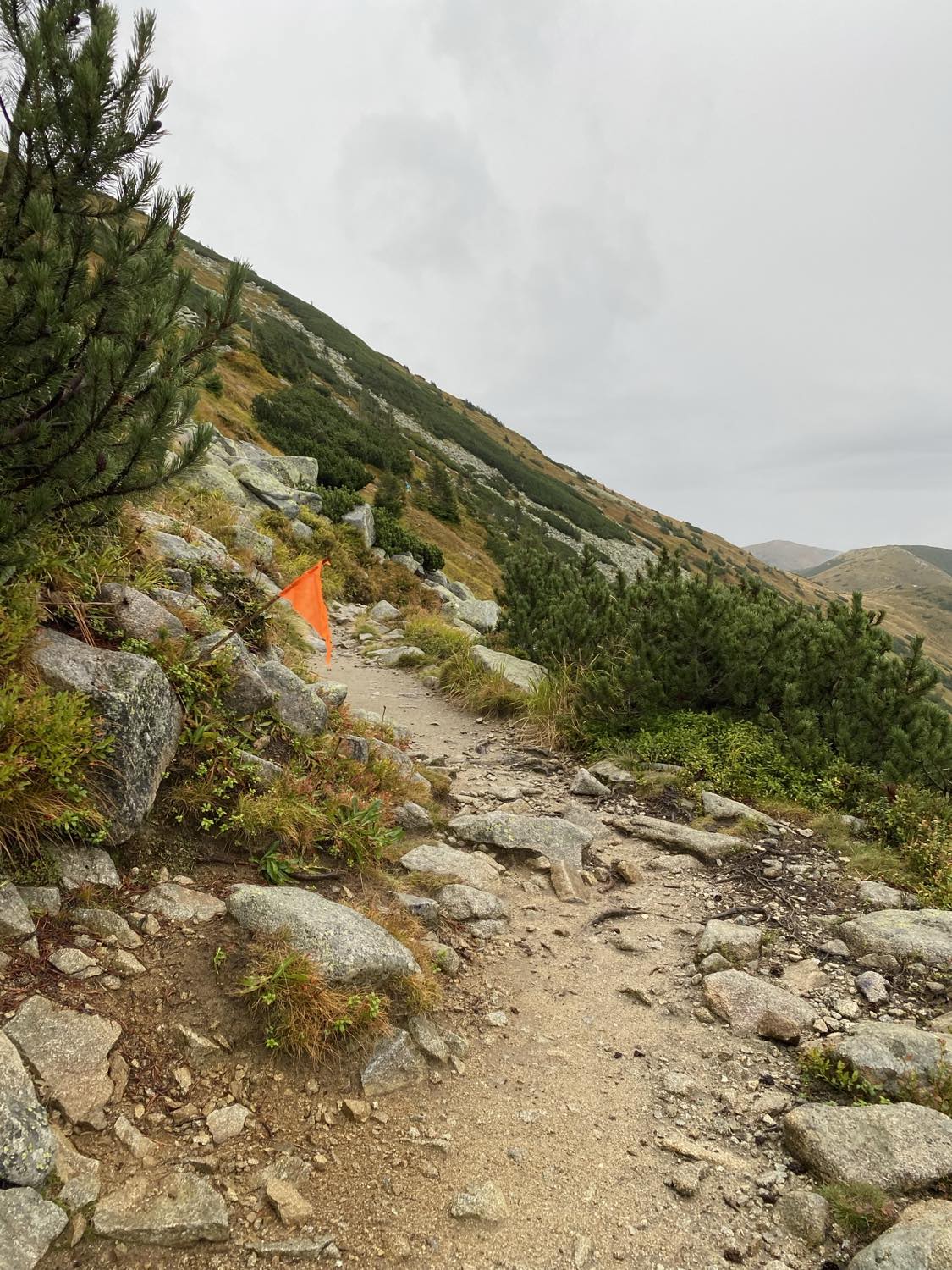 Vaciláltam, vigyek-e botot vagy se, mert az első két és fél kilis mászásban, ami egy sípályán történik, nem használható. Utána meg nagyon köves, sziklás végig a talaj, oda meg minek. (Végül nem vittem.)