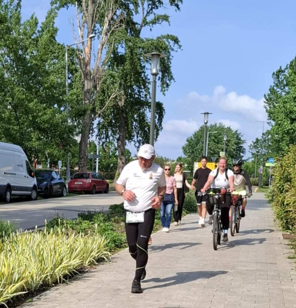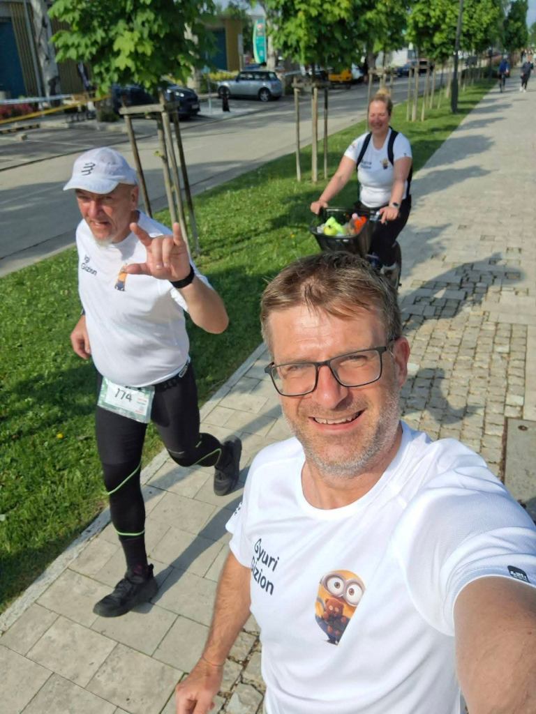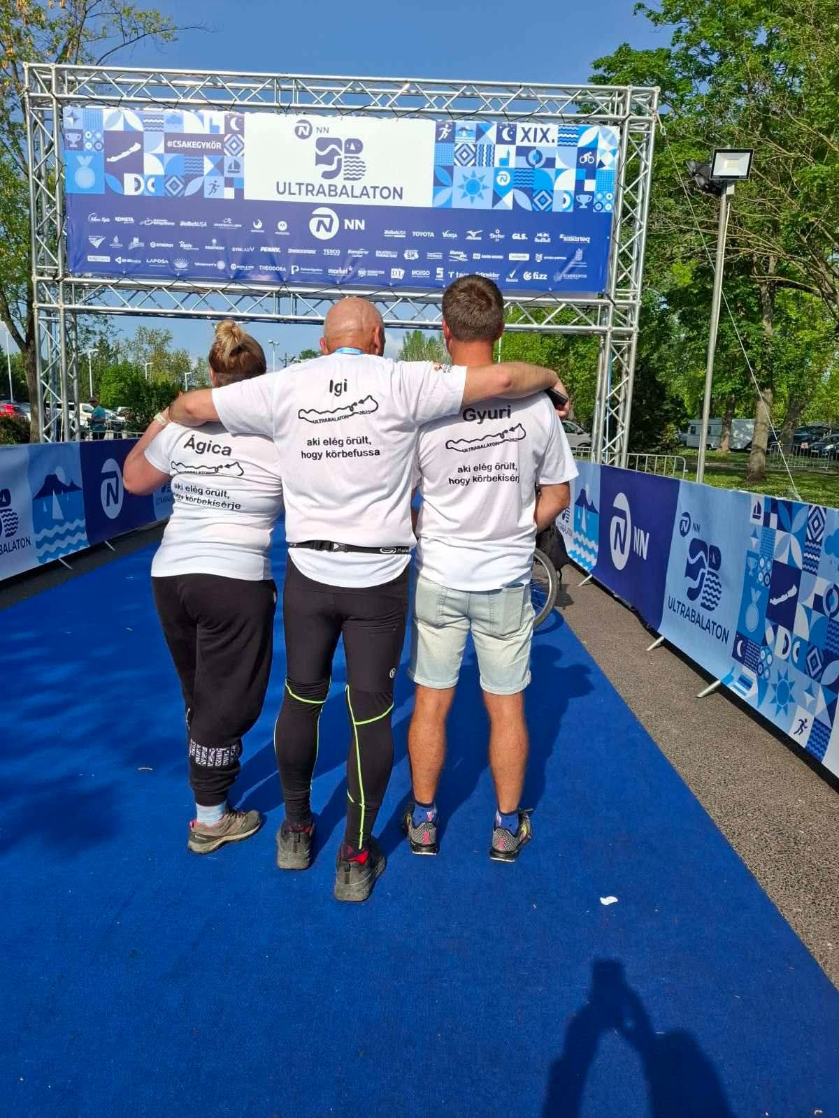 Megérkeztek, Igi nekirogyott a kocsinak. „Ági nagyon szarul vagyok” – hangzott el. Mondom okés, figyelj Igi. Tudom, hogy szar, nehéz, fáj valami? Hát a lábak nem mozognak, fájnak…. Gondoltam magamban okés, ezzel nem ártunk hátha jó lesz kis placebo, megkérdeztem mit szólna egy fájdalomcsillapítóhoz. Jöhet, volt a válasz, így gyorsan kikevertem. Majd jött a lelki löket, ezúton is hála Szandrának, Igi feleségének, hogy ezt megosztotta velem, emlékeztettem rá Igit, milyen üzenetet hagyott otthon a tükrön: MEGCSINÁLOM! Emlékeztettem rá, hogy itt veszteni való nincs bármi is lesz az időeredmény, de azért jött, hogy körbemenjen és én bizony amíg össze nem esik tovább fogom rugdosni. Pár könnycsepp elcseppent és Igi kiegyenesedve elindult tovább. Én következtem a kíséretben. Számomra ez volt a legnehezebb szakasz. Tántorogva kocogva haladt a futóm. Féltem, féltettem, jót tettem-e azzal, hogy továbblöktem, de hessegettem is el a gondolatot, Ági erősnek kell lenned, minden rendben, ez csak fáradtság. Aztán Igi egyszercsak lefeküdt az árokparton. Lepattantam a bicóról, mondtam neki bocs Igi, de ezt nem és már húztam is fel. Kértem, ha szédül egy pár másodpercre kapaszkodjon belém, szedje szépen össze magát, de haladjunk aztán tovább, ezt itt biztos nem fogjuk befejezni. És aztán Igi megint szó nélkül szépen tette a dolgát. Már többnyire gyors gyaloglás volt de haladtunk legalább.