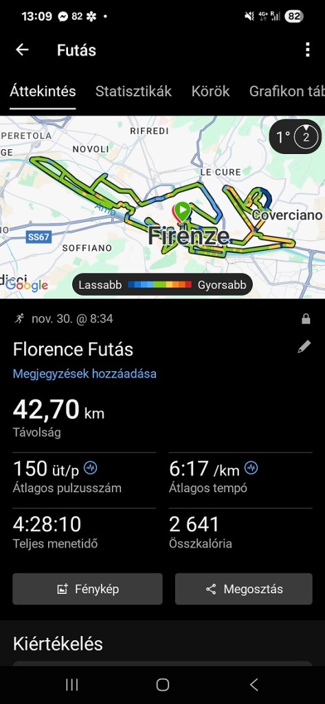 Annyira jól éreztem már magam, hogy november elején bekattant, hogy mi lenne, ha mégiscsak a maratoni távon indulnék. Osztottam, szoroztam a szintidővel, a tempókkal, a távval, és kiszámoltam, hogyha az első 10 km menne futva, akkor a többire maradna annyi időm, hogy sétálva éppen beleférjek a 6 órás szintidőbe. Szuper kihívásnak éreztem, amiért érdemes küzdenem. Ismét elkezdtem hajnali 4h-kor futni, mint valamikor régen, munka után pedig gyalogoltam, amennyit csak bírtam. Többnyire szintes útvonalakon, hogy ne legyen gondom a firenzei hidakkal.
