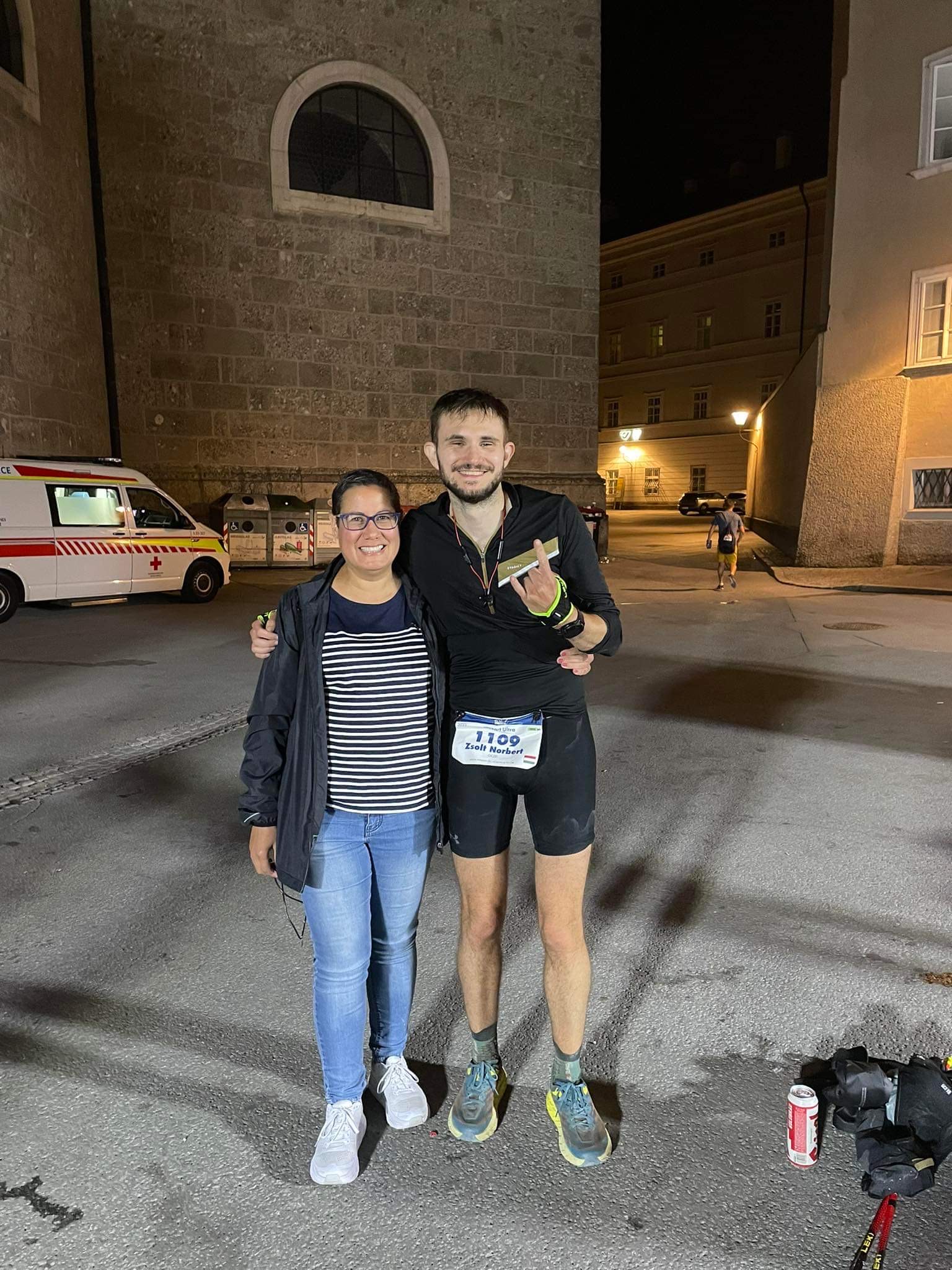 Nagy megkönnyebbülés volt, mikor felbukkantak az első házak és beértem Salzburgba, de még túl kellett lenni a Kapuzinerberg-en. Itt előzetesen arra számítottam, hogy az utolsó tartalékaimat fogom elhasználni, ettől függetlenül, ha nem is esett már jól próbáltam minél előbb túl lenni rajta. Itt a lépcsőzés már nem is zavart, mert legalább nem csúszott a sártól felfelé, így csak tettem a lábaimat egymás után sorba, nem kellett azon gondolkodnom hova lépek. Felérve nagy levegőt vettem és meg sem álltam a célig. Óvatos lejtőzés, újabb lépcsők, de innen már láttam a hidat, ahol át fogok haladni és a templom előtti teret ez még adott annyi pluszt, hogy a városon keresztül is futóhoz hasonló mozgásban haladjak. Azt sosem gondoltam volna, hogy egyszer a szombat délutáni salzburgi csúcsforgalmat miattam állítja meg két rendőr, hogy megállás nélkül átkelhessek a zebrán. Innen már jól ismertem az utat, elhaladtam a sátor mellett, ahol előzőnap felvettem a rajtszámomat, mindenhol szurkoló tapsoló emberek, akik az utolsó métereken is biztatnak. Egy balos kanyar, szembenállok a céllal és átfutok rajta. Nyakamba akasztja egy szervező a befutóérmet és ezzel az idei első nagy kihívás teljesítve.