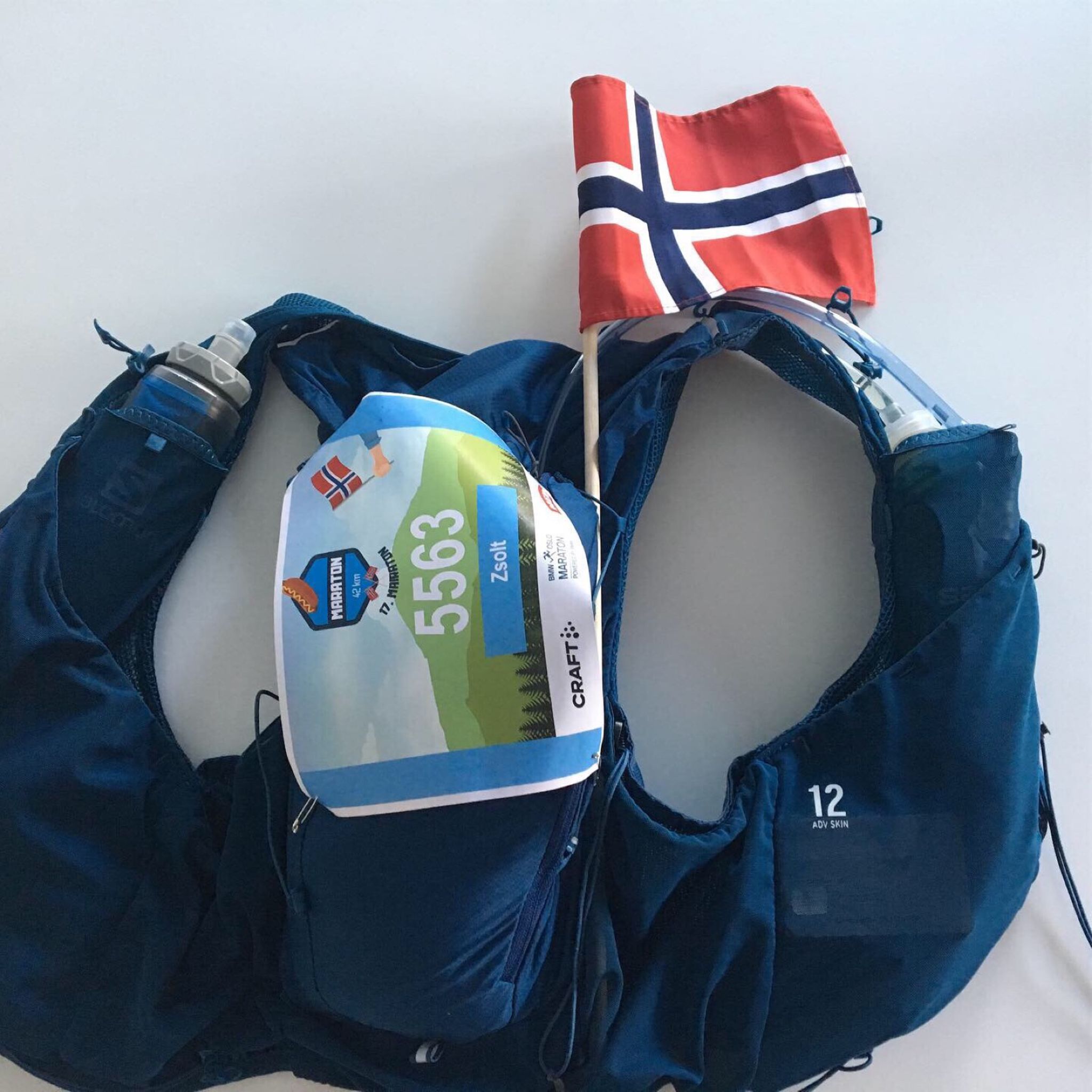 A maraton rajtolt először, de én is futással kezdtem a napot, mert elszámoltam a tervezett szurkolói pontom rajttól mért távolságát, és azt hittem, nem érek oda időben. Aztán meg vagy fél órát vártam a mezőny elejére (biztos a sok napsütés). Nagyon klassz volt szurkolni egy ilyen helyen, általában én voltam az egyetlen a szurkolói ponton, de nem voltam magányos, ott volt nekem az izgatottság, a permanens öröm és látvány, amivel nem tudtam betelni.. Néha egy-két gyerek rázendített, hogy heia-heia, más különösebb nem nagyon történt. Olykor én is szurkoltam norvégül, amikor meg várakoztam, próbáltam mélyre szívni a természeti környezet jelentette csodát. A BSI-től kölcsönzött magyar zászlómat a nagy szélben hirtelen jött ötletek mentén próbáltam ide-oda kifeszíteni. Azok kedvéért, akik nem ismerőseim facebookon, a legkreatívabb megoldásom az lett, hogy a zászló két sarkát rákötöttem a combomra, a harmadikat fogtam, a negyediket meg a szélre bíztam. Krisz nem tudta, hogy van nálam zászló, így jó kis meglepetés volt az első találkozásunk – olyannyira, hogy először azt hitte, találkoztam más magyarokkal, és csak lassan esett le neki, hogy mivel egy nemzetközi versenyeket is ügyező, sporteseményeket szervező cégnél dolgozunk, nem nagy túl bonyolult a raktárból szerezni egy magyar zászlót. A futás jól ment neki, de a szél nagyon kemény volt, a pálya egy részén oldalról kapta, később azt mesélte, ilyenkor többször összeütötte a bokáját. Az útvonal közel fele szembeszélben zajlott. 30 kilométernél – bár nem mondta – már láttam rajta, hogy nagyon megviseli, s bár onnantól el kellett kezdeni készülni a saját futamomra, mindenekelőtt inkább őt vártam a célban. A német fiú, akivel kb. 25 kilométerig együtt futottak, az utolsó harmadban elhúzott, Krisz második helyen ért célba 3:11-es idővel, ami az időjárási körülményeket nézve szerintem állati szuper teljesítmény. Ha nem lett volna rajtam kesztyű, a tíz körmöm lerágtam volna a kettejük célba érése közötti tíz percben, annyira izgultam. Aztán a speakernek el kellett magyarázni, hogy “nem, az nem olasz zászló, és aki alatta fut, az sem olasz, hanem magyar”. Nagyon büszke és boldog voltam. Sok munka, sok átfutott hajnal van ebben az eredményben. Melegváltás volt, amit a rajt/célban megejtettünk. Ő óra.11-kor ért be, én óra.15-kor rajtoltam. Mivel nem volt jól, nem akartam elindulni, de ezt ő nyilván nem hagyta. Átvette a hátizsákom, amelynek nyitott oldalzsebében hűlt már a söre, útravalóul pedig annyit mondott, készüljek fel rá, hogy az útvonal második fele nagyon kemény lesz, majd eldördült a rajtpisztoly. Abba akkor még bele sem gondoltam, hogy ami az ő mércéjével kemény, az nálam a lehetetlen kategória.