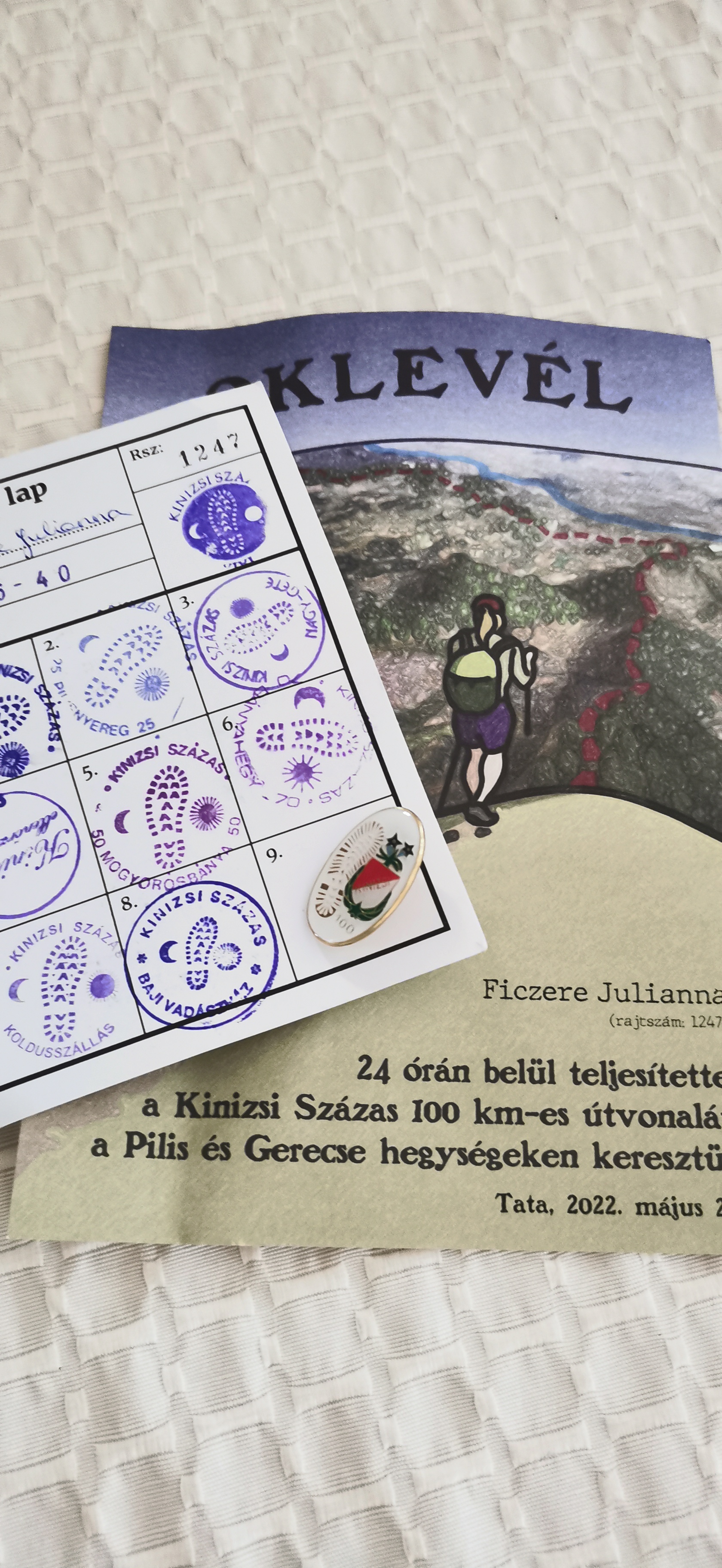 Ati az utolsó 1 kilométerre elém sétált és együtt mentünk végéig a Tatai ifjúsági táborba. Szürreális élmény volt a célba érkezés, egy terembe kellett bemenni, ahol hideg neoncső világított és bent síri csönd fogadott. Pecsét a lapomra, lecsippantva a kártya, majd egy kézfogás és megkaptam a teljesítésért járó kitűzőt. Meghatódtam, de nem volt sírhatnékom. Azt gondolom azért, mert tudtam, hogy képes vagyok erre a teljesítésre. Büszke voltam, hogy jól viseltem a végén a megpróbáltatásokat. Atira nézve pedig végtelen szeretetet és hálát éreztem, amiért nap mint nap támogatott és végül szívből örült a sikeremnek.