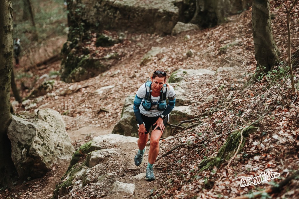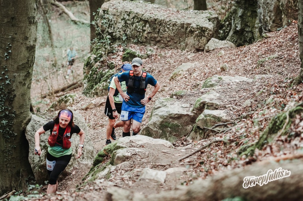 A táv felénél, elhagyva Várgesztest, újabb kihívást jelentett az előre jelzett napsütéses idő érkezése. Tudtuk, hogy emelkedik a hőmérséklet, mégis hirtelen csapott fejbe a meleg. Pont ekkor haladtunk fej-fej mellett Urvölgyi Balázzsal, s elegyedtünk szóba egymással, majd rövid bemutatkozást követően együtt is mentünk tovább majdnem teljesen a célig, segítve egymást. Ő engem motivált a futásra a felfeléken, én pedig őt az avarral, s akadályokkal borított kis kanyokban, s legalább a figyelmemet is elvette az óra szüntelen jelzéseitől: megmagyarázhatatlan módon, megzavarodva 80- 120 közé kezdte belőni az értékeket, néhol pedig megugrott 160-ra is a kijelzőn látható szám mindez 1-2 perc különbséggel…