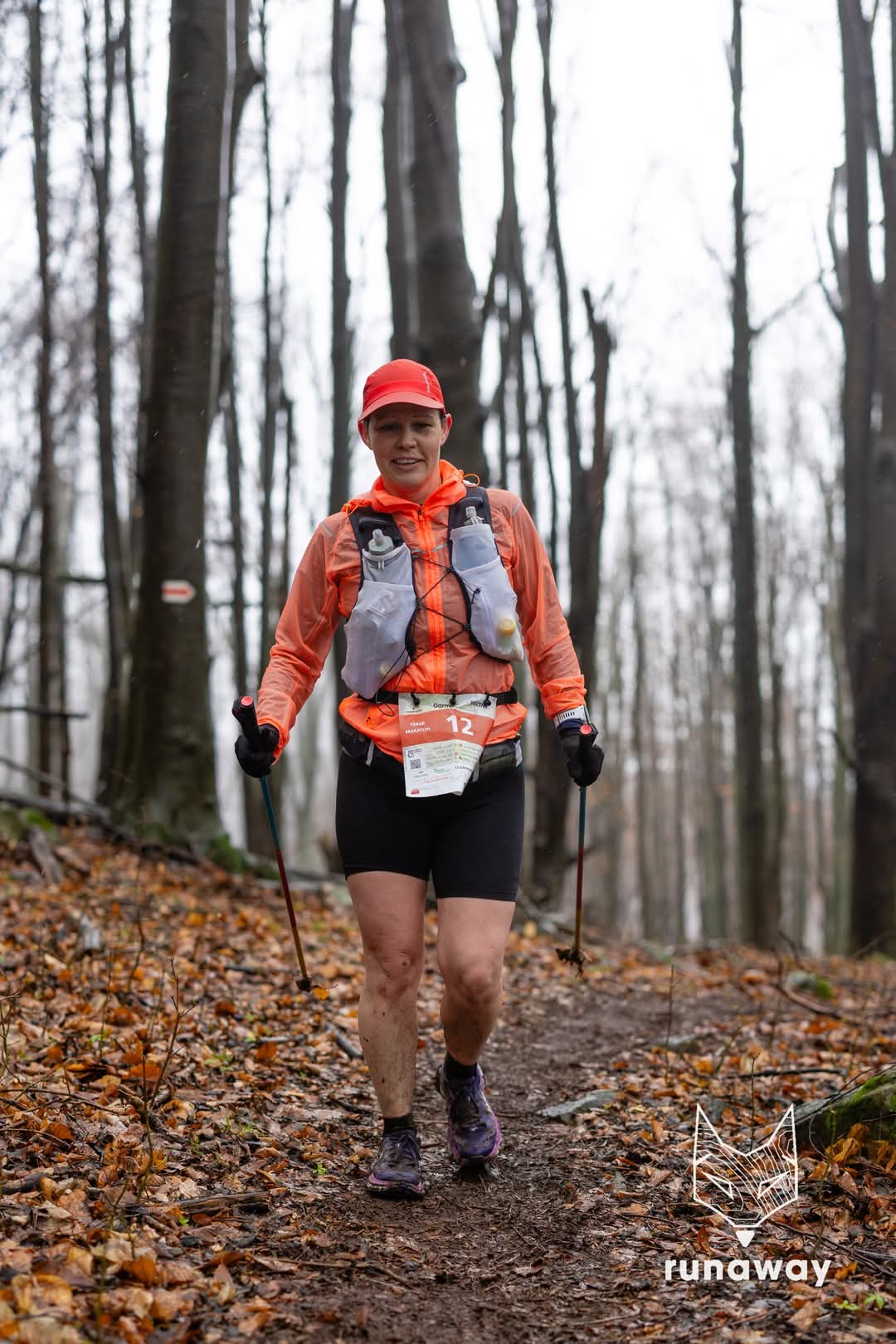Elindultunk, az első 2,5 km aszfalt, utána, ahogy bekanyarodtunk az erdőbe, és jött az első mászás 3-4 kilinél már vettem is elő a botot, ami innentől végig a kezemben volt. Nem lehetett eltenni, volt hogy a kezemben összefogva futottam a botokkal, de ezek rövid szakaszok, percek voltak, nem volt értelme eltenni.