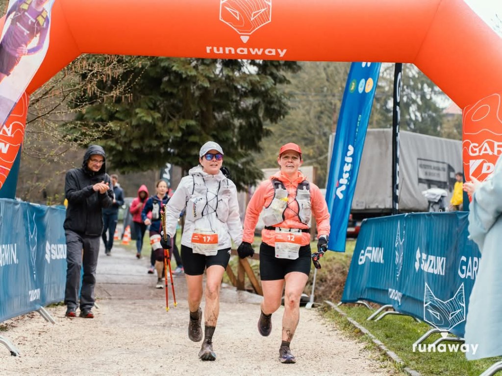 Azt hiszem ez a fegyelmezettség és fókusz végig megvolt, nem is volt holtpontom. NHH-ra fefelé azt hittem ott marad vhol a dagonyában a cipőm, eszméletlen sár volt és persze szakadt az eső. Vagy ezt mondtam már? :)) Köd is volt rendesen itt-ott, de ekkor láttam, hogy Juli már feljött és egészen közel van hozzám. NHH után, kb. 35-6 kilinél ért utol. Itt megbeszéltük, hogy innentől együtt futunk be. Nekem nagyon jól esett a végén együtt tolni, beszélgettünk arról, kinek milyen volt a pálya. A végén már több cifra szó is elhangzott a számból, mert ahol lehetett volna csapatni se tudtunk rendesen menni a sártól és a csúszós kövekből, de azért toltuk amennyire lehetett. Itt jó pár embert előztünk, 33 kiliseket is, meg pár maratonista lányt is behoztunk. Végül női 6. helyen, 6 óra 49 perccel, kézen fogva, óriási örömmel értünk célba.