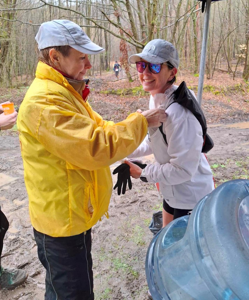 A 33km és terepmaraton mezőnye együtt rajtolt. Az első 2,5km aszfaltos szakaszon szépen rendeződött a mezőny, az első patakátkelésnél nem is volt már torlódás. A vízállás itt még nem volt riasztó, bőven voltak kilátszó lapos kövek. A teljes távot a frissítőpontok közötti szakaszokra osztottam fel fejben. Az első 13,5km-nél volt, ahol Gabi és a Gizionok vártak bennünket. Úton a frissítő felé Bettivel megbeszéltük, hogy kicsit meleg az esőkabát, illetve már látszik, a botra biztosan szükség lesz. Az első frissítőpontnál Királyházán óriási sárban álldogáltak Gabiék. Ahogy az asztalhoz értem Zsuzsi máris kérdezte mire van szükségem, nagyon profin frissített. Amint végeztem, és kiindultam a pontról, Betti is beért.